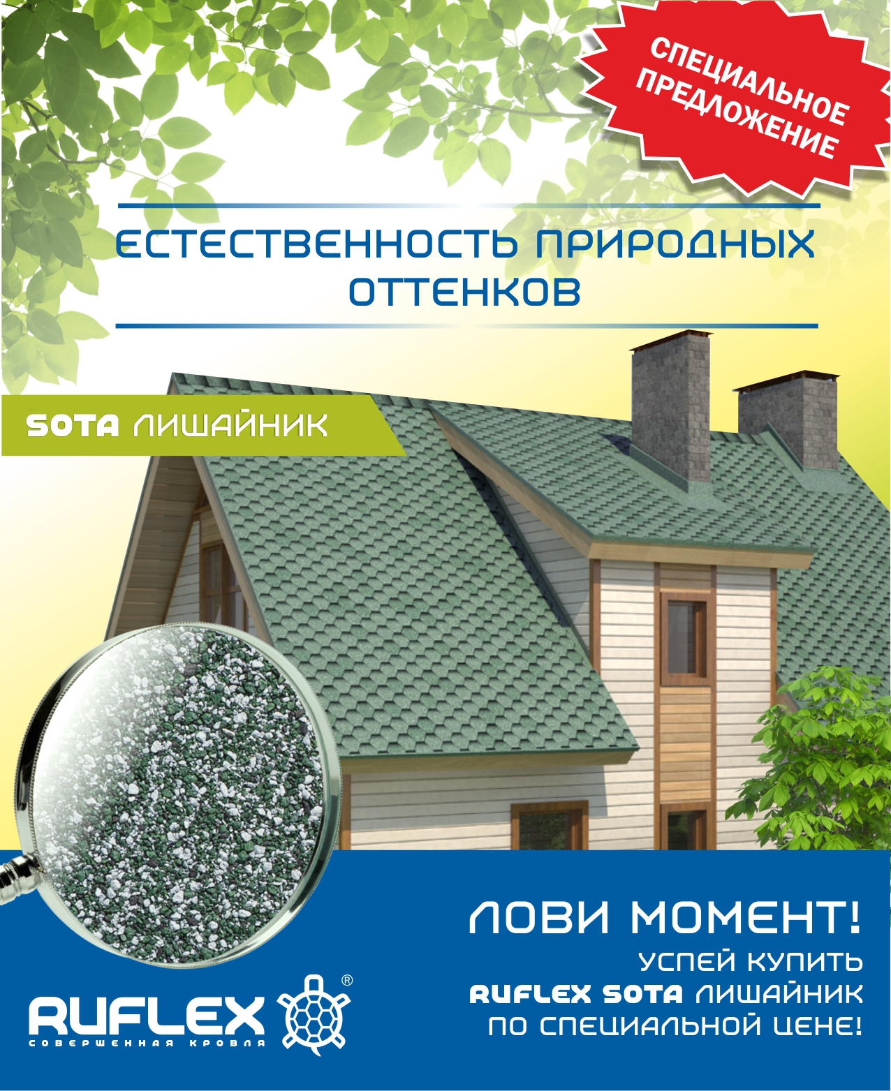 Предлагаем Вам приобрести коллекцию гибкой черепицы RUFLEX Sota, эксклюзивного цвета "Лишайник", по специальной цене!